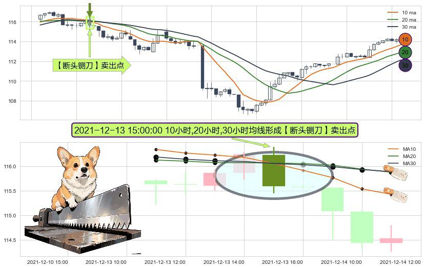 形态多维评估: ⚀ 2021-12-13 15:00:00小时显现 10小时-20小时-30小时均线 【断头铡刀】卖出点 看空信号,后市看跌,卖出