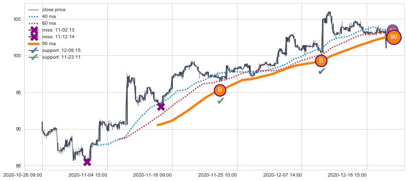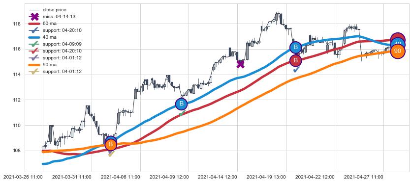 上涨趋势03-26 11:00-04-27 14:00,均线40, 90, 60确认关键支撑3处