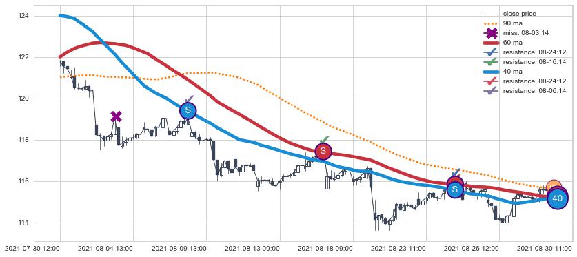 下跌趋势07-30 12:00-08-30 11:00,均线40, 60确认关键阻力3处