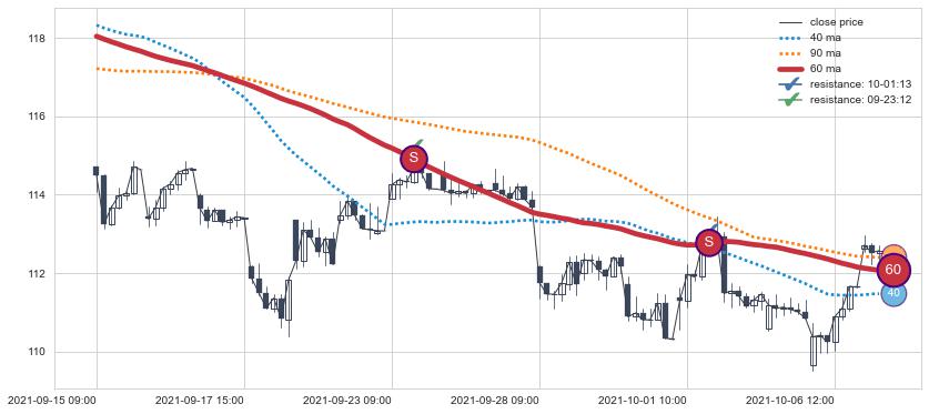 下跌趋势09-15 09:00-10-07 11:00,均线60确认关键阻力2处