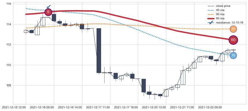 下跌趋势12-15 12:00-12-22 11:00,均线60确认关键阻力1处