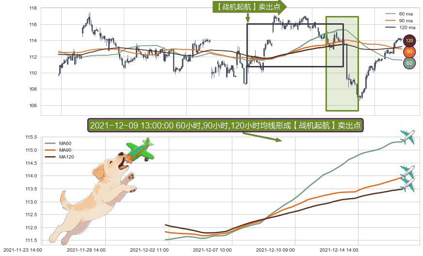 形态多维评估: ⚀ 2021-12-02 10:00:00小时-2021-12-16 13:00:00小时显现 60小时-90小时-120小时均线 【战机起航】卖出点 看空信号,后市看跌,卖出