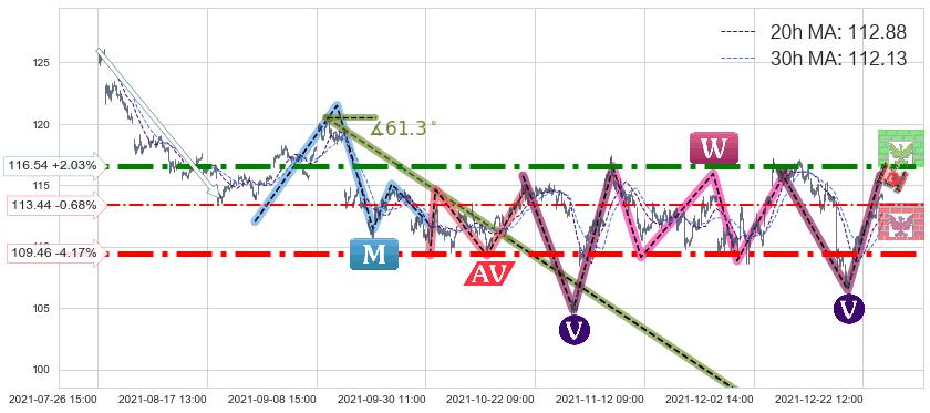 ♘ 支撑价格位113.44,可信任强度42.73%,距离最后交易2021-12-27 16:00形成的收盘价格114.22相差 -0.68%