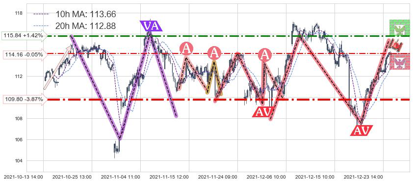 ♘ 阻力价格位115.84,可信任强度59.93%,距离最后交易2021-12-27 16:00形成的收盘价格114.22相差 +1.42%