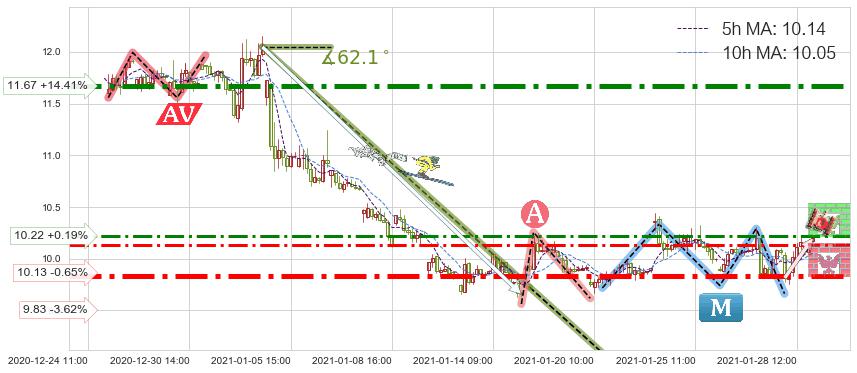 ♘ 支撑价格位9.83,可信任强度86.04%,距离最后交易2021-01-28 16:00形成的收盘价格10.20相差 -3.62%