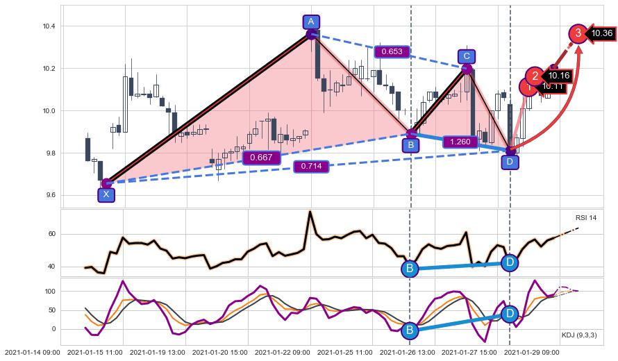 ➢ 谐波价格D点比B点低 ⤵,【KDJ】指标D点比B点高 ⤴️