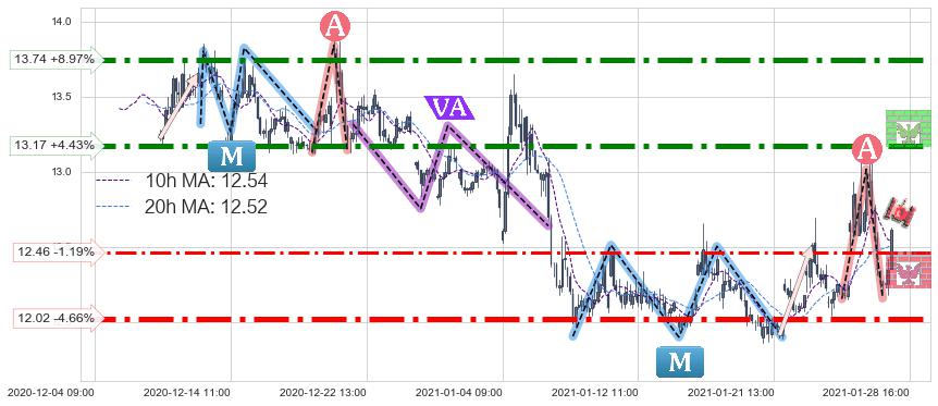 ♘ 支撑价格位12.02,可信任强度91.87%,距离最后交易2021-01-28 16:00形成的收盘价格12.61相差 -4.66%