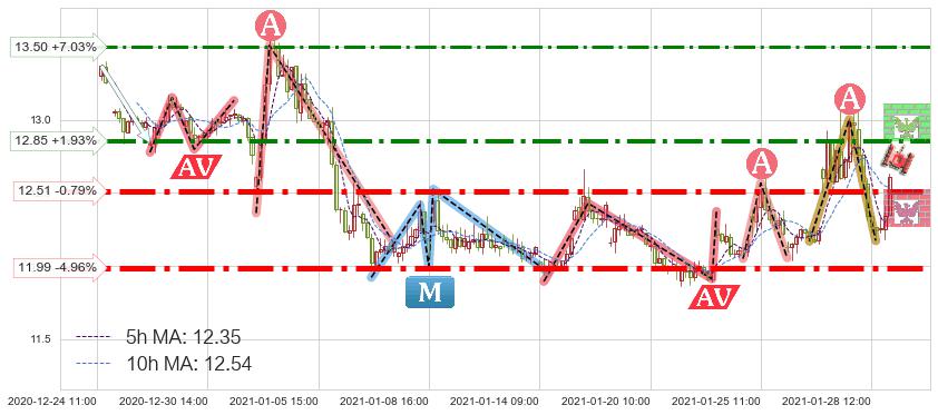 ♘ 支撑价格位12.51,可信任强度87.39%,距离最后交易2021-01-28 16:00形成的收盘价格12.61相差 -0.79%