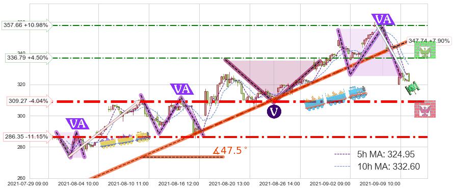 ♘ 阻力价格位336.79,可信任强度42.32%,距离最后交易2021-09-09 14:00形成的收盘价格322.28相差 +4.50%