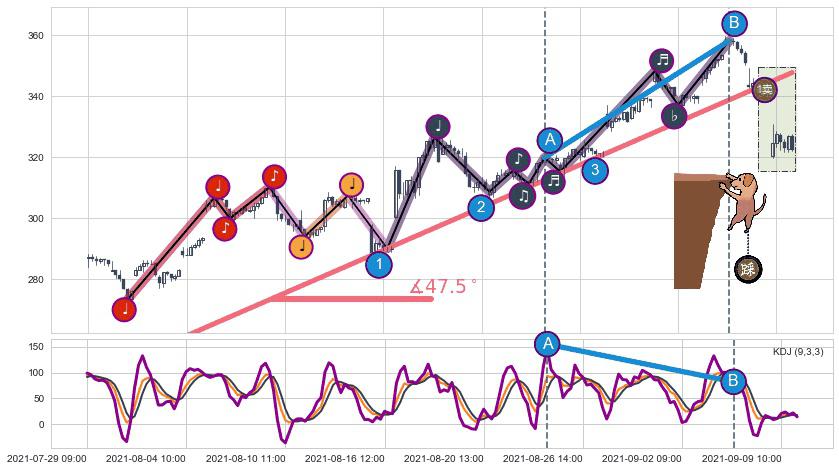 从2021-07-29 09:00至2021-08-09 13:00,共包含47个小时,阶段股价上涨7.82%,阶段股价变动位移路程比: 1 : 3