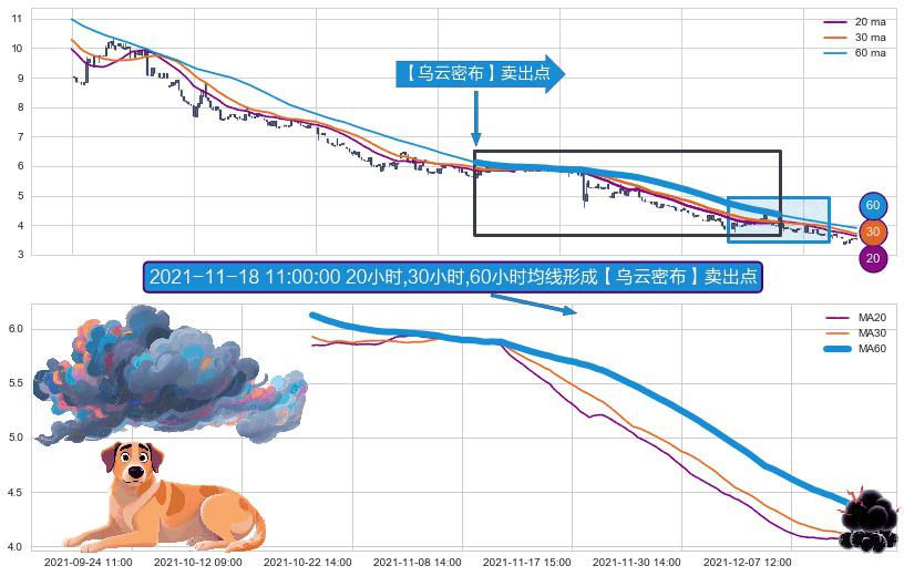 形态多维评估: ⚀ 2021-10-19 13:00:00小时-2021-12-13 09:00:00小时显现 20小时-30小时-60小时均线 【乌云密布】卖出点 看空信号,后市看跌,卖出