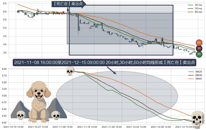 形态多维评估: ⚀ 2021-11-09 10:00:00-小时至2021-12-15 09:00:00-小时显现 20小时-30小时-60小时均线 【死亡谷】卖出点 看空信号,后市看跌,卖出