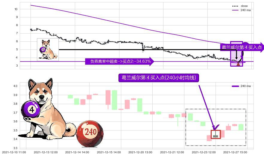 形态多维评估: ⚀ 2021-12-23 12:00:00-小时显现 葛兰威尔均线 240小时均线 第④买入点 下降趋势均值回复的短线反弹信号,后市看涨,买进信号