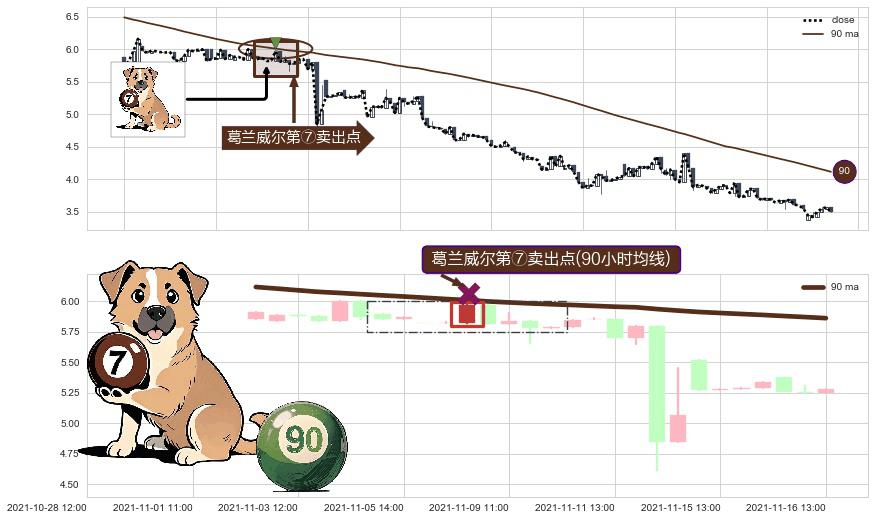形态多维评估: ⚀ 2021-11-08 16:00:00-小时显现 葛兰威尔均线 90小时均线 第⑦卖出点 下降趋势的中继信号,后市看跌,卖出信号