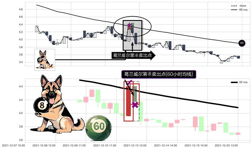 形态多维评估: ⚀ 2021-12-13 10:00:00-小时显现 葛兰威尔均线 60小时均线 第⑧卖出点 下降趋势的中继信号,后市看跌,卖出信号