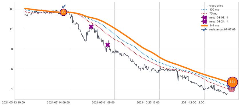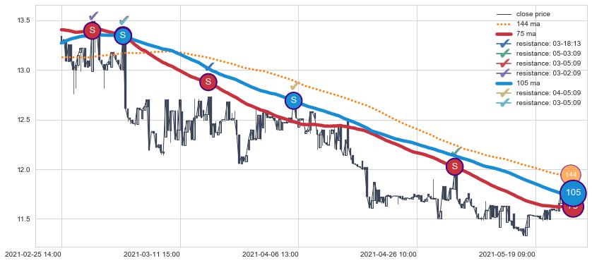 下跌趋势02-25 14:00-05-24 12:00,均线105, 75确认关键阻力5处