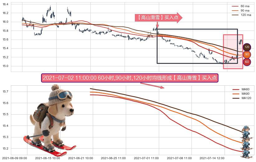 ⚀ 2021-06-18 15:00:00小时-2021-07-16 13:00:00小时显现 60小时-90小时-120小时均线 【高山滑雪】买入点 看多信号,后市看涨,买入