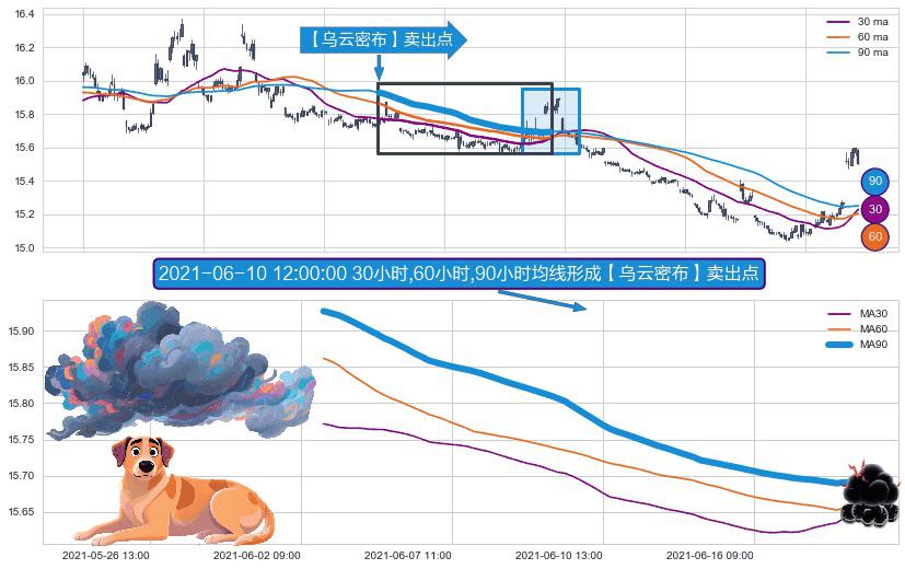 ⚀ 2021-06-02 12:00:00小时-2021-06-18 11:00:00小时显现 30小时-60小时-90小时均线 【乌云密布】卖出点 看空信号,后市看跌,卖出