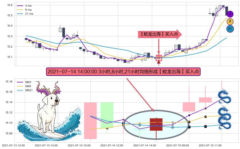 ⚀ 2021-07-14 14:00:00小时显现 3小时-8小时-21小时均线 【蛟龙出海】买入点 看多信号,后市看涨,买入