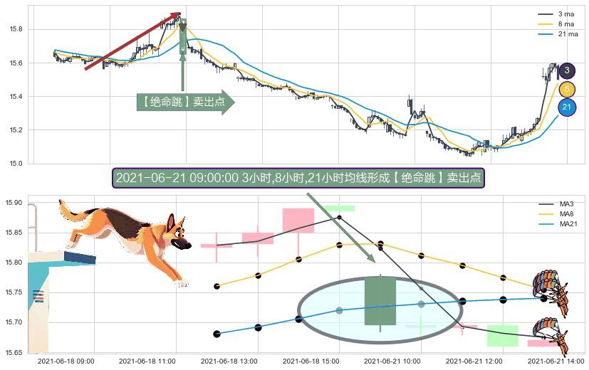 ⚀ 2021-06-21 09:00:00小时显现 3小时-8小时-21小时均线 【绝命跳】卖出点 看空信号,后市看跌,卖出