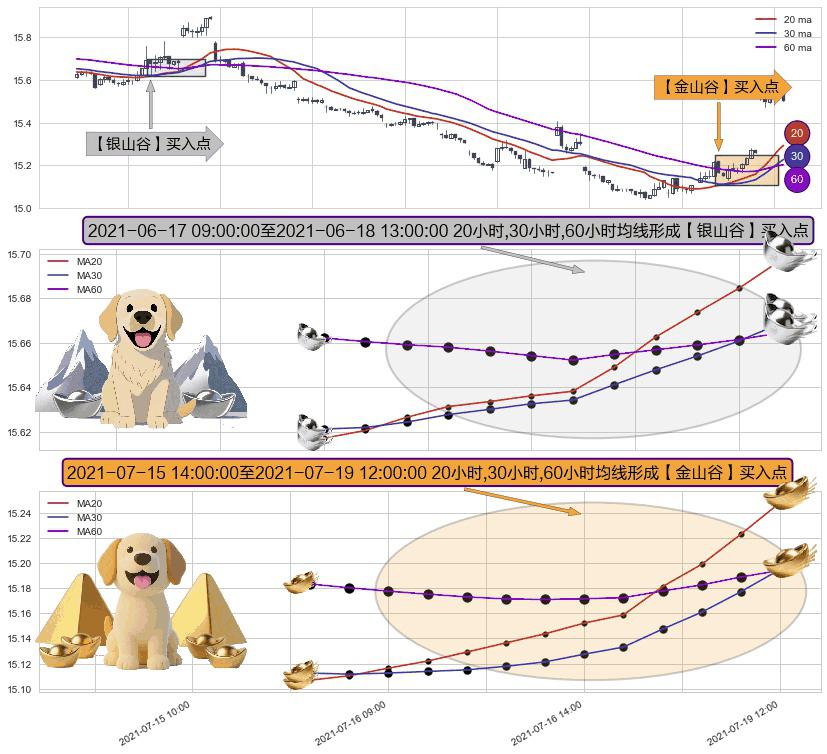 ⚄ 2021-07-16 09:00:00-小时至2021-07-19 12:00:00-小时显现 20小时-30小时-60小时均线 【金山谷】买入点 其再次确认了买入信号,可靠性更强,买入