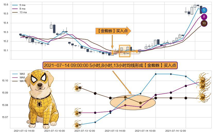 ⚀ 2021-07-14 09:00:00小时显现 5小时-8小时-13小时均线 【金蜘蛛】买入点 看多信号,后市看涨,买入