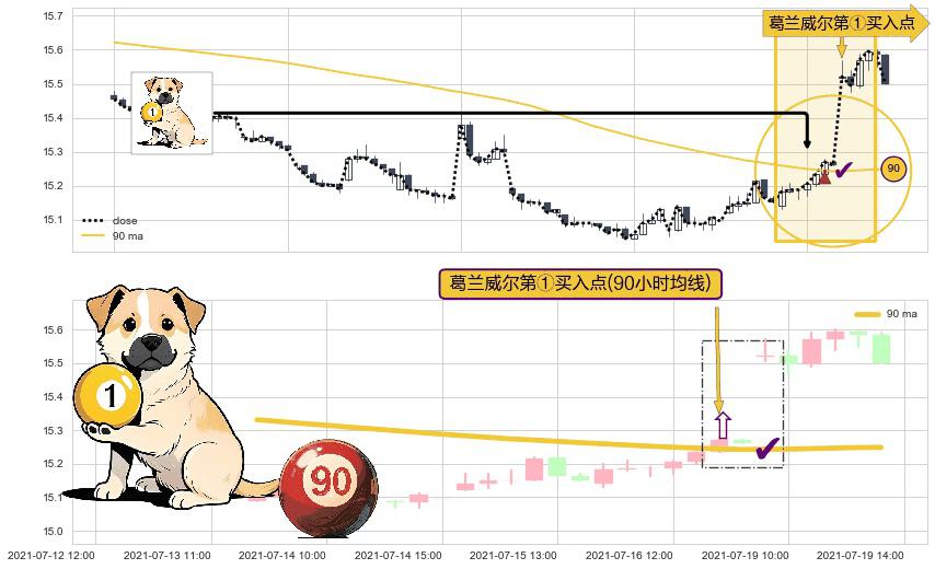 ⚀ 2021-07-16 14:00:00-小时显现 葛兰威尔均线 90小时均线 第买①入点 走势反转见底信号,后市看涨,买进信号