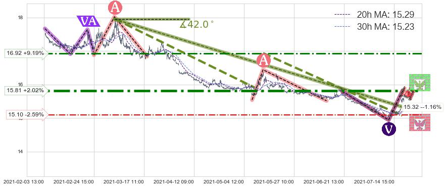 🦴 长线均值回复组合短线趋势跟踪[强阻力信号]2021-03-04 13:00-2021-07-19 11:00下跌趋势依然成立(下跌趋势跟踪依然存在),短线价格略微上行反弹(均值回复猜想),即将接近下跌趋势提供的未破位阻力价格:15.32。