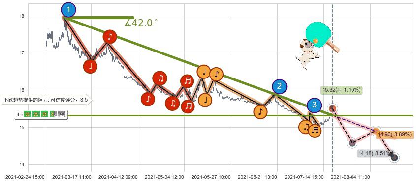 ➣ 预测:2021-08-06 09:00,【试探阻力】稳定目前下跌趋势的前提下,预测价格:14.90