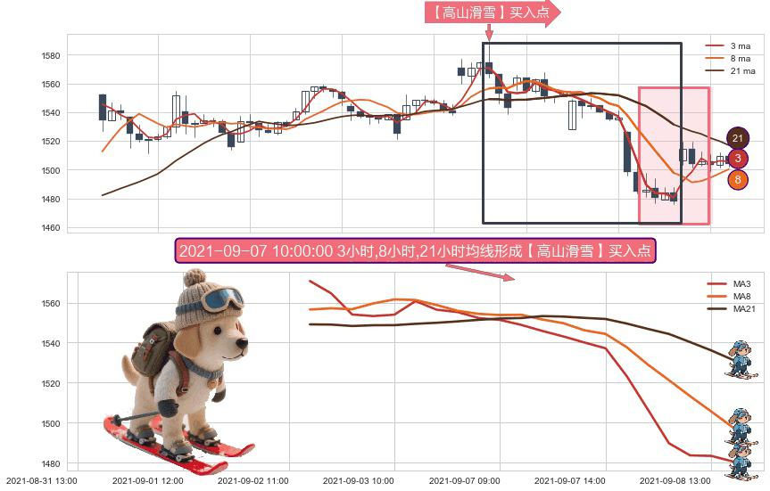 ⚀ 2021-09-02 12:00:00小时-2021-09-08 14:00:00小时显现 3小时-8小时-21小时均线 【高山滑雪】买入点 看多信号,后市看涨,买入