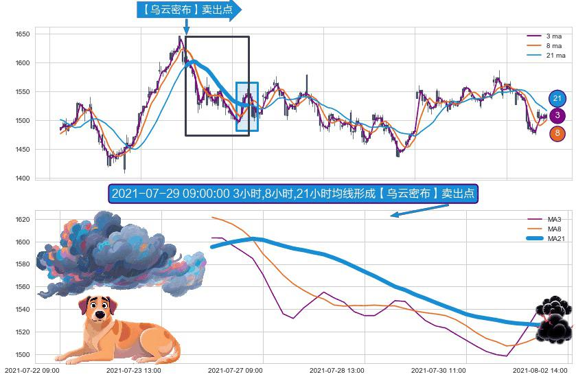 ⚀ 2021-07-26 11:00:00小时-2021-08-02 12:00:00小时显现 3小时-8小时-21小时均线 【乌云密布】卖出点 看空信号,后市看跌,卖出