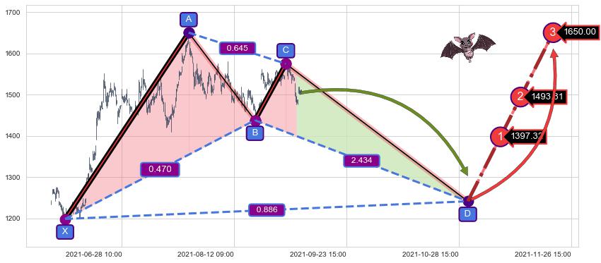 ➢ 距离预测D点位置有足够的下跌空间, 与看涨【蝙蝠】形态相反,实际方向【看跌】