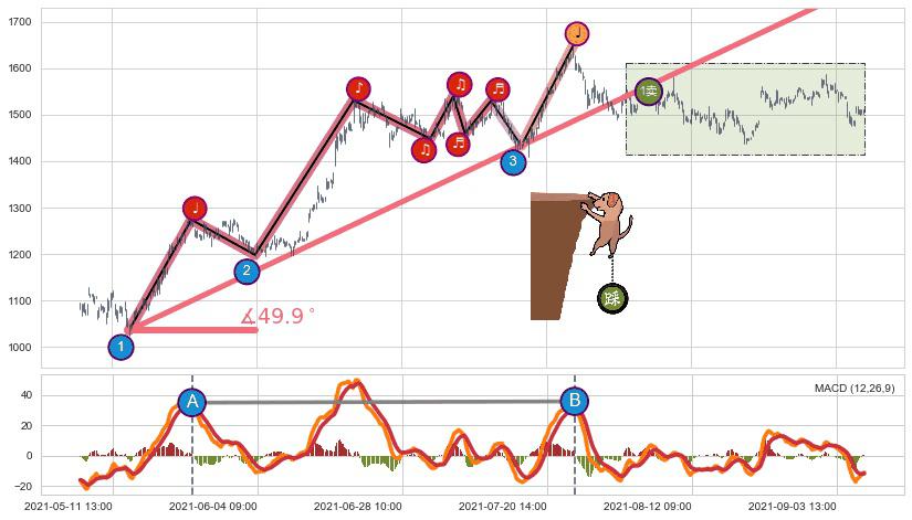从2021-05-13 12:00至2021-07-15 11:00,共包含267个小时,阶段股价上涨34.64%,阶段股价变动位移路程比: 1 : 4,上涨趋势角度: 63.9