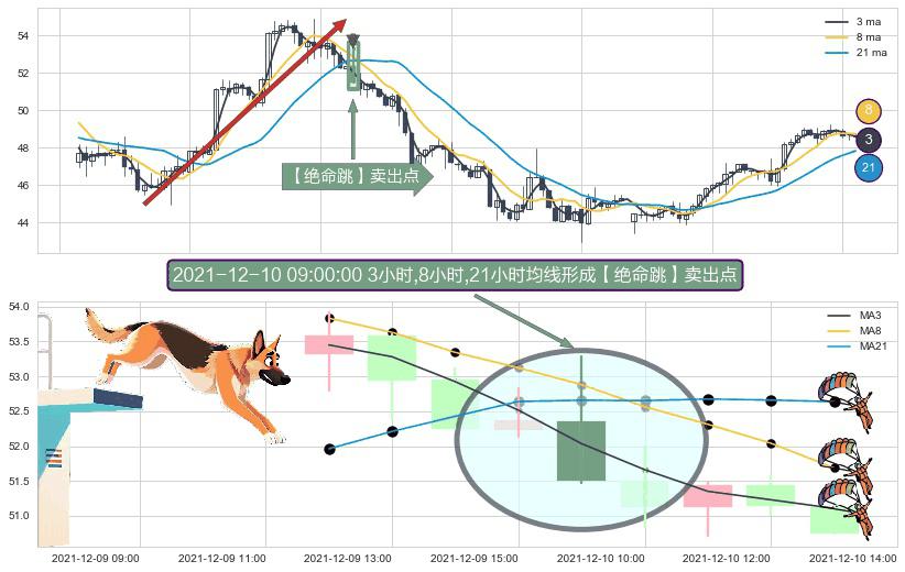 ⚀ 2021-12-10 09:00:00小时显现 3小时-8小时-21小时均线 【绝命跳】卖出点 看空信号,后市看跌,卖出