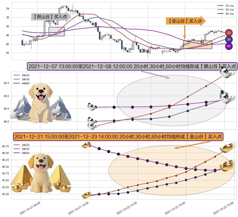 ⚃ 2021-12-22 09:00:00-小时至2021-12-23 14:00:00-小时显现 20小时-30小时-60小时均线 【金山谷】买入点 其再次确认了买入信号,可靠性更强,买入