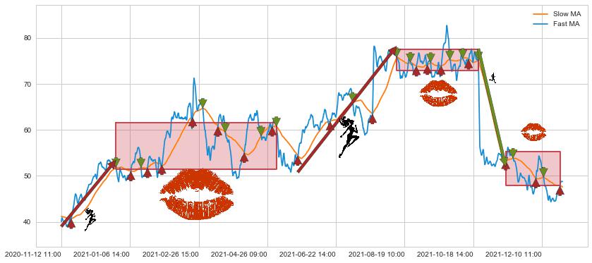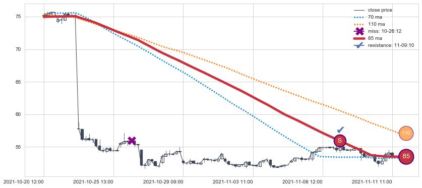 ⚅ 卖点向下突破均线后,价格走势有持续向下的迹象,但动能稍显不足,迟迟不能远离均线