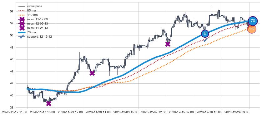 ⚅ 卖点向下突破均线后,价格走势很纠结,不断在均线周围试探,有再次上探突破均线的可能