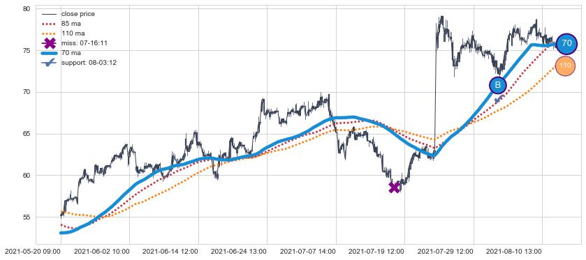 ⚁ MA3和MA8走势平行,且始终保持在短距离内,MA21始终在短中期均线下方,与短中期均线保持一定的距离,微微上行