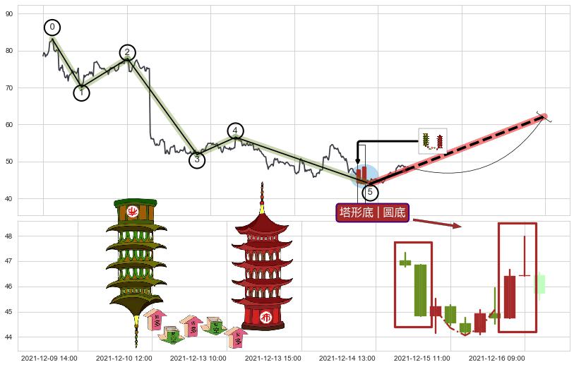 | 13 🅚:塔形底 | 圆底 ➕ ☯️:缠论买卖点下降缠:猜想2买趋势延续,蓄力上涨至3买(大周期趋势均值回复中的小周期趋势跟踪) ☞ 看多信号 ⇥ 【🅚线】交织【图形】⇥ 综合量化分数: 58 | > |