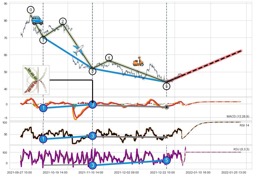 ➢ 1,3,5驱动浪MACD, RSI, KDJ走势都出现【常规背离】反转信号增强