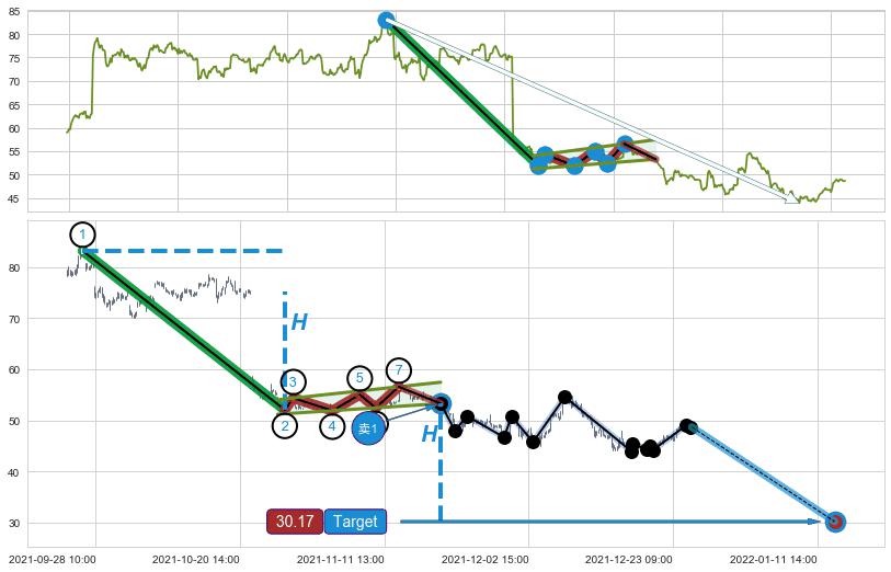 从2021-07-19 11:00至2021-12-20 15:00,共包含688个小时,阶段股价下跌-18.35%,阶段股价变动位移路程比: 1 : 31,下跌趋势角度: 42.9,2021-10-22 09:00向↘︎形成缺口,跳空下跌-23.18%˚