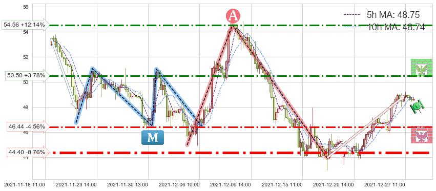 ♘ 支撑价格位46.44,可信任强度69.82%,距离最后交易2021-12-27 15:00形成的收盘价格48.66相差 -4.56%