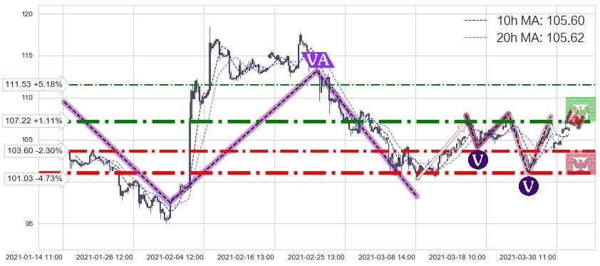 ♘ 阻力价格位107.22,可信任强度89.44%,距离最后交易2021-03-31 14:00形成的收盘价格106.04相差 +1.11%