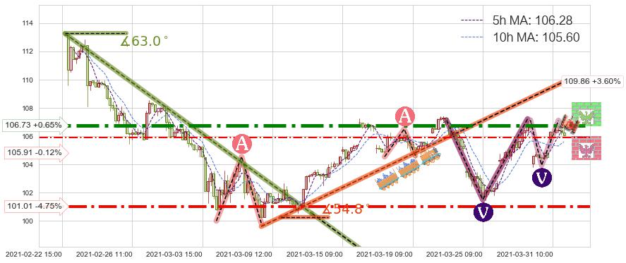 ♞ 5小时均线:106.28,10小时均线:105.60→ 快线>慢线