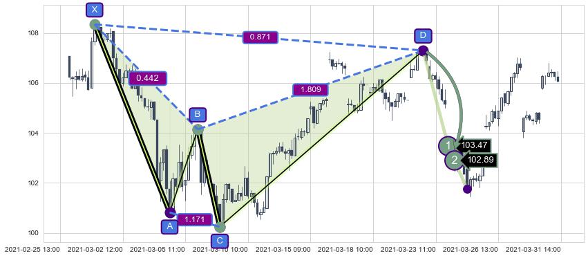 ➣ 未完成【伽利】形态起点X: 02-23:15, 已到达C点: 03-25:09, 预测最终D点: 04-12:14, 共215交易小时