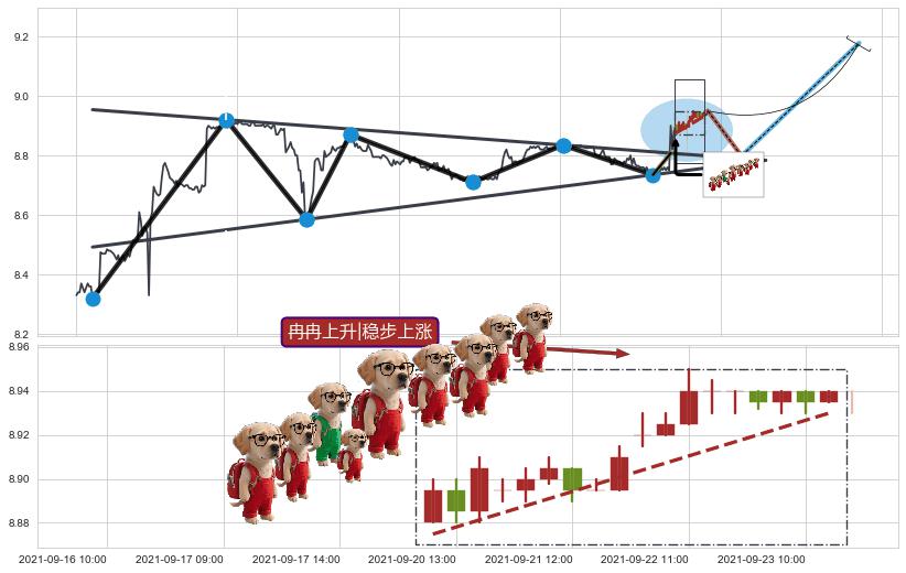 ➣ 【多空双方观望→争持→促使价格波动日益狭窄→多方打破攻守平衡点】对称三角形中继整理, 已在09-20:09突破【阻力】颈线 8.81 →演变成上升通道