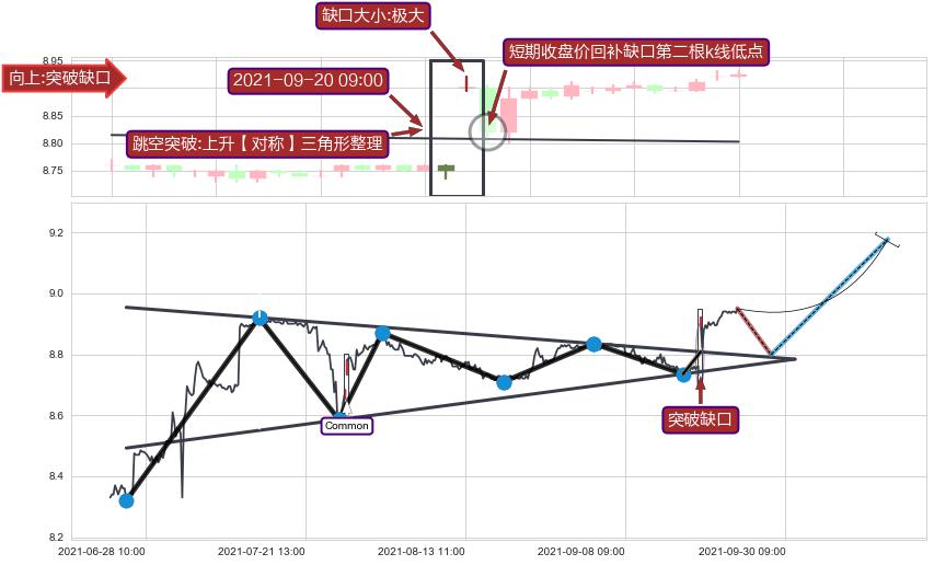 ➣ 突破缺口形成后,后续k已经超过14根,跳空突破上升【对称】三角形整理关键点后, 出现【中度回踩】迹象,短期收盘价回补缺口第二根k线低点