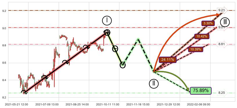 ➢ 循环浪继续向上【最高】位置(02-25:14, 9.21),匹配聚类样本比例13.69%, 可能性概率3.30%