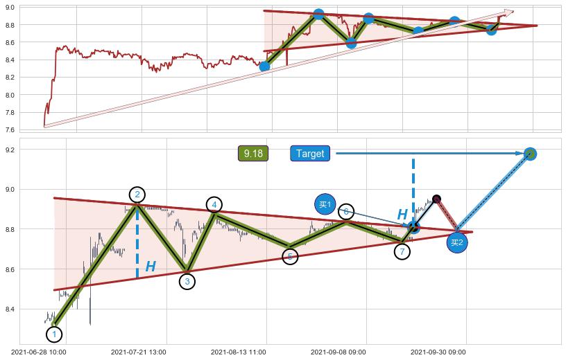 ➢ 最小中继整理涨幅→𝐇: 0.36988 (高点逐步降低斜边第一阻力点②与支撑边垂直距离)