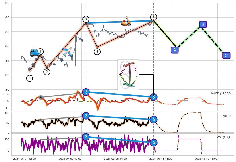 ➢ 1,3,5驱动浪MACD, RSI, KDJ走势都出现【常规背离】反转信号增强
